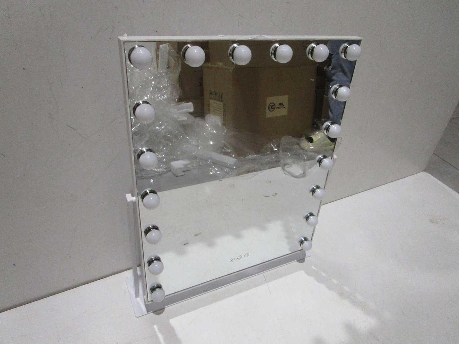 The LED Vanity Mirror is a large, professional-style mirror featuring 18 integrated LED light bulbs for bright, uniform illumination. Designed with a durable plastic frame and a sturdy metal base, it offers both stability and a modern aesthetic suitable for dressing tables or salon environments.