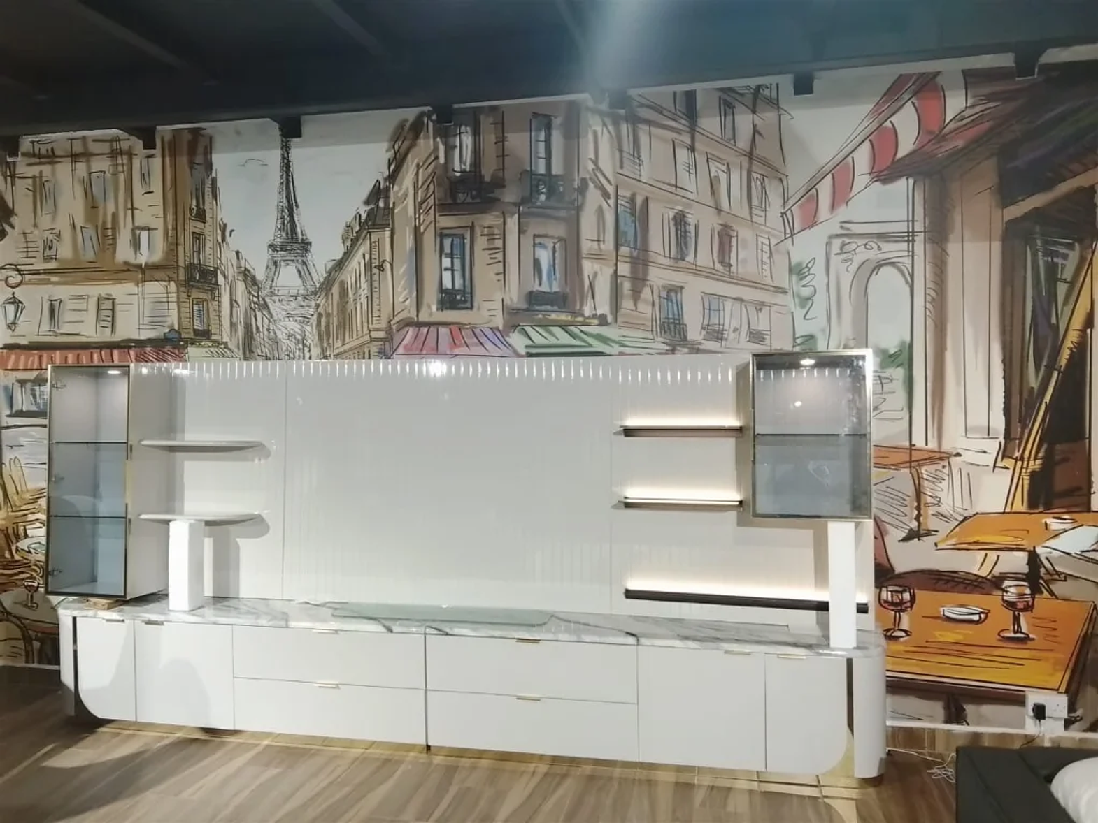 Transform your living space with this premium Wall-Hanging Cabinet and TV Stand set, crafted to deliver both elegance and functionality. Finished in high gloss light grey and light gold with sleek black hardware and black-and-white detailing, this set brings a sophisticated edge to contemporary interiors. Measuring 3800×352/400×1160/550 mm, it offers ample storage for media devices, décor, and essentials while maintaining a clean, streamlined look. The wall-mounted design maximizes floor space and creates an airy, modern atmosphere, while the glossy surfaces reflect light beautifully, enhancing the sense of luxury. Perfect for modern homes, this set blends bold aesthetics with everyday practicality, making it the ultimate centerpiece for your entertainment area. Wall hanging cabinet + tv stand high gloss light grey - high gloss light gold + black hard ware black&white 3800*352/400*1160/550 #ref:6028# 5cl#