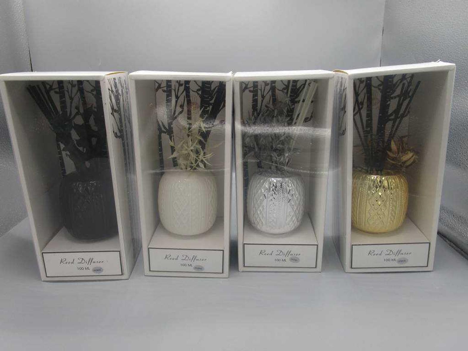AROMA DIFFUSER,PVC PACKING,100ML, 6 FRAGRANCE: ROSE,LAVENDER,LILY,JASMINE, OCCEAN, LEMON CERAMIC BOTTLE12X10.6X27WHITE GOLD BLACK SILVER #REF:H19017# 1CL= 48AC#