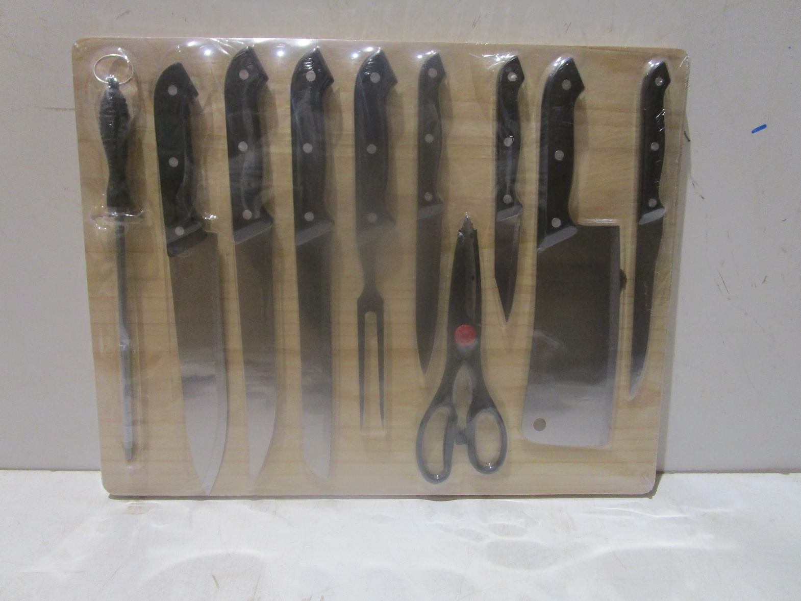 Cultery set-11pcs wood cutting board plastic handle, 2cr13 stainless steel blister packing black handle45*35*2cm #ref:kf-1050a# 12ac#