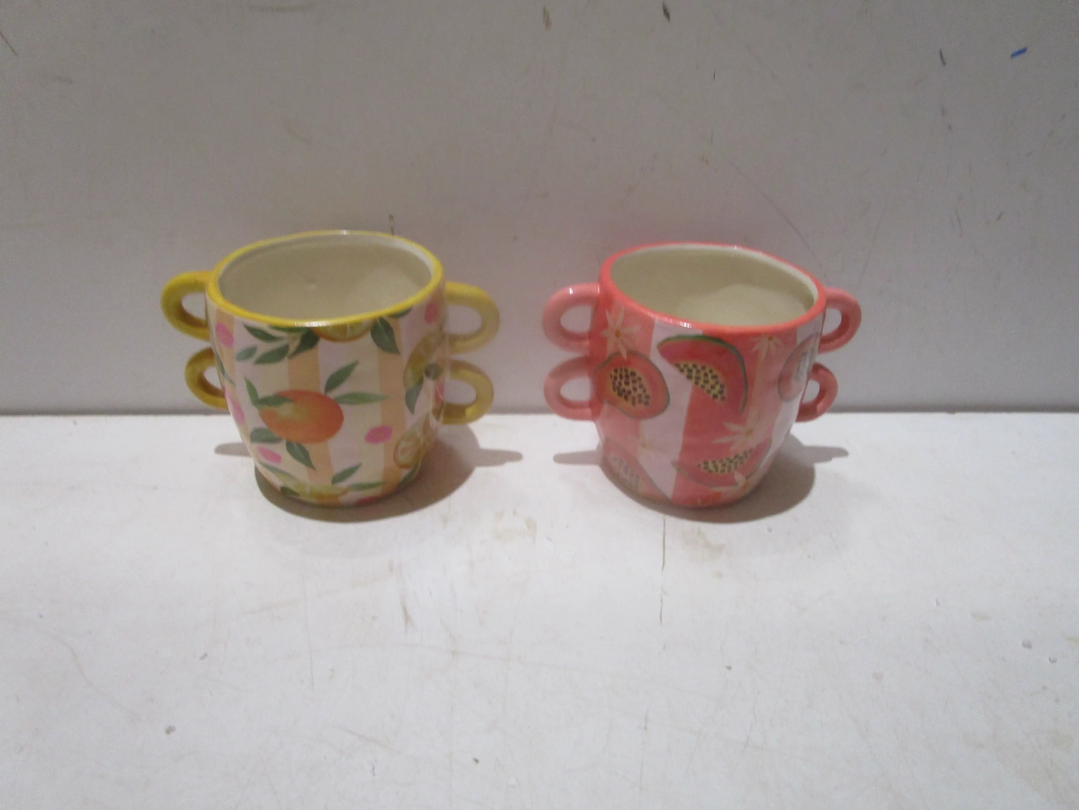 Cup ceramic with handel, two color mix in one carton yellow pink dolomite 23x16x15 #ref:d246140 g/1# 8ac#