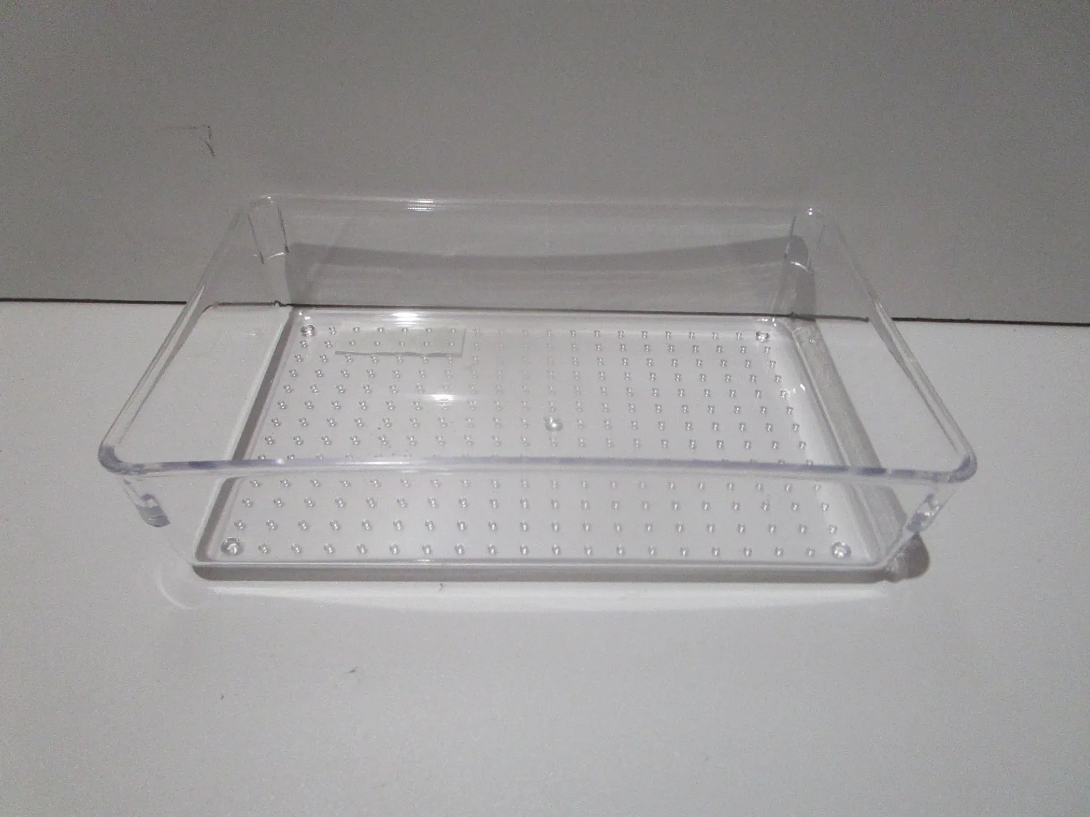 Bring systematic order to your cluttered drawers and cabinets using this robust, crystal-clear organizer tray. Constructed from high-quality polystyrene, this unit is designed for long-term durability and resistance to wear, making it a reliable household organizer. The transparent material allows for effortless identification of contents, eliminating rummaging and maximizing efficiency in any setting, from the kitchen to the workspace. Its interior features a subtle, raised dot pattern to help prevent items from sliding around inside the tray. With dimensions of approximately 22.5 cm x 15 cm and a height of 5.5 cm, this versatile tray is perfectly sized for fitting into standard drawer spaces and grouping similar small accessories together.