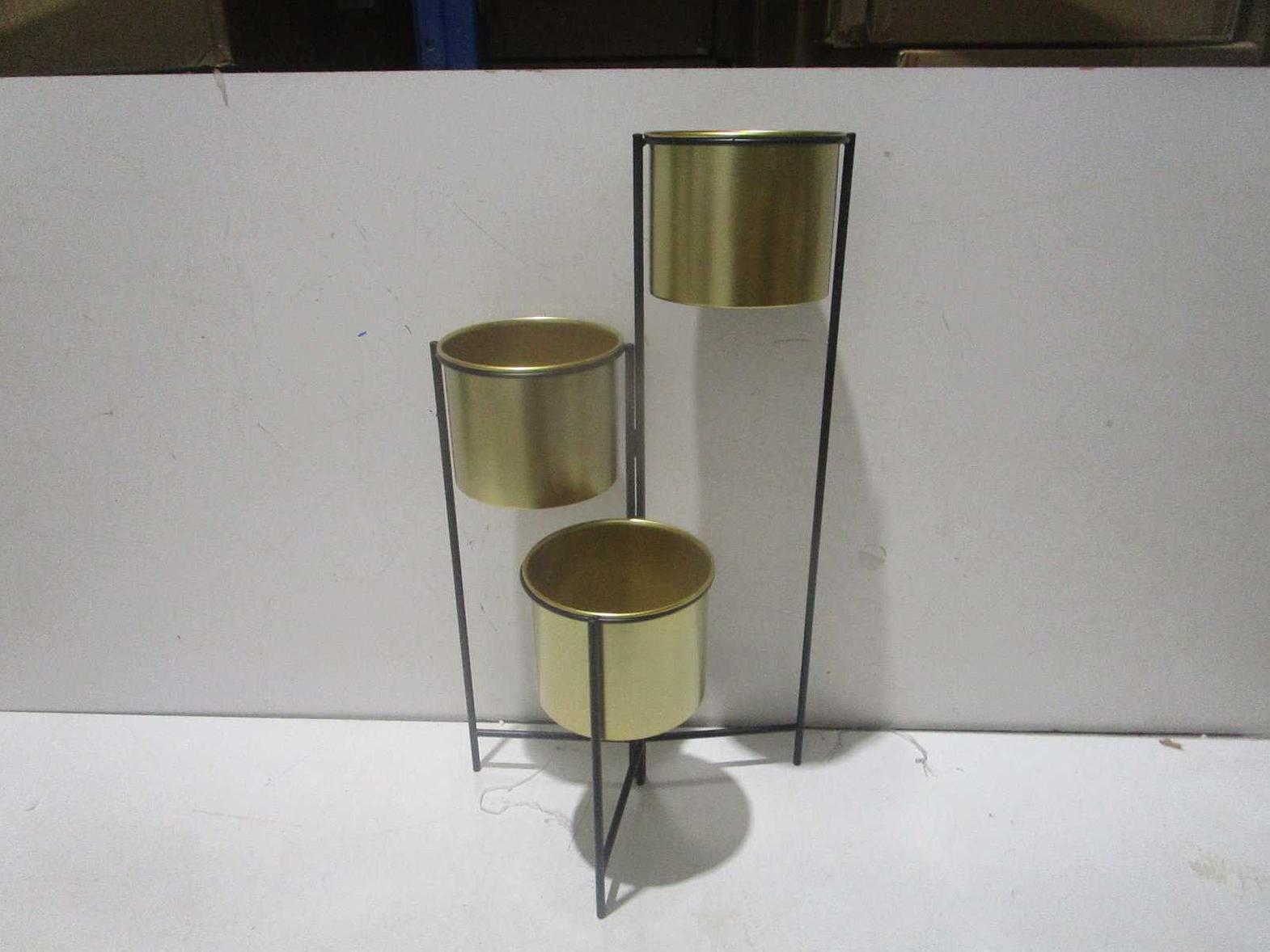 The Flower Shelf is a three-pot plant stand designed with a sturdy black metal frame and gold-finished pots, combining modern elegance with functional greenery display.