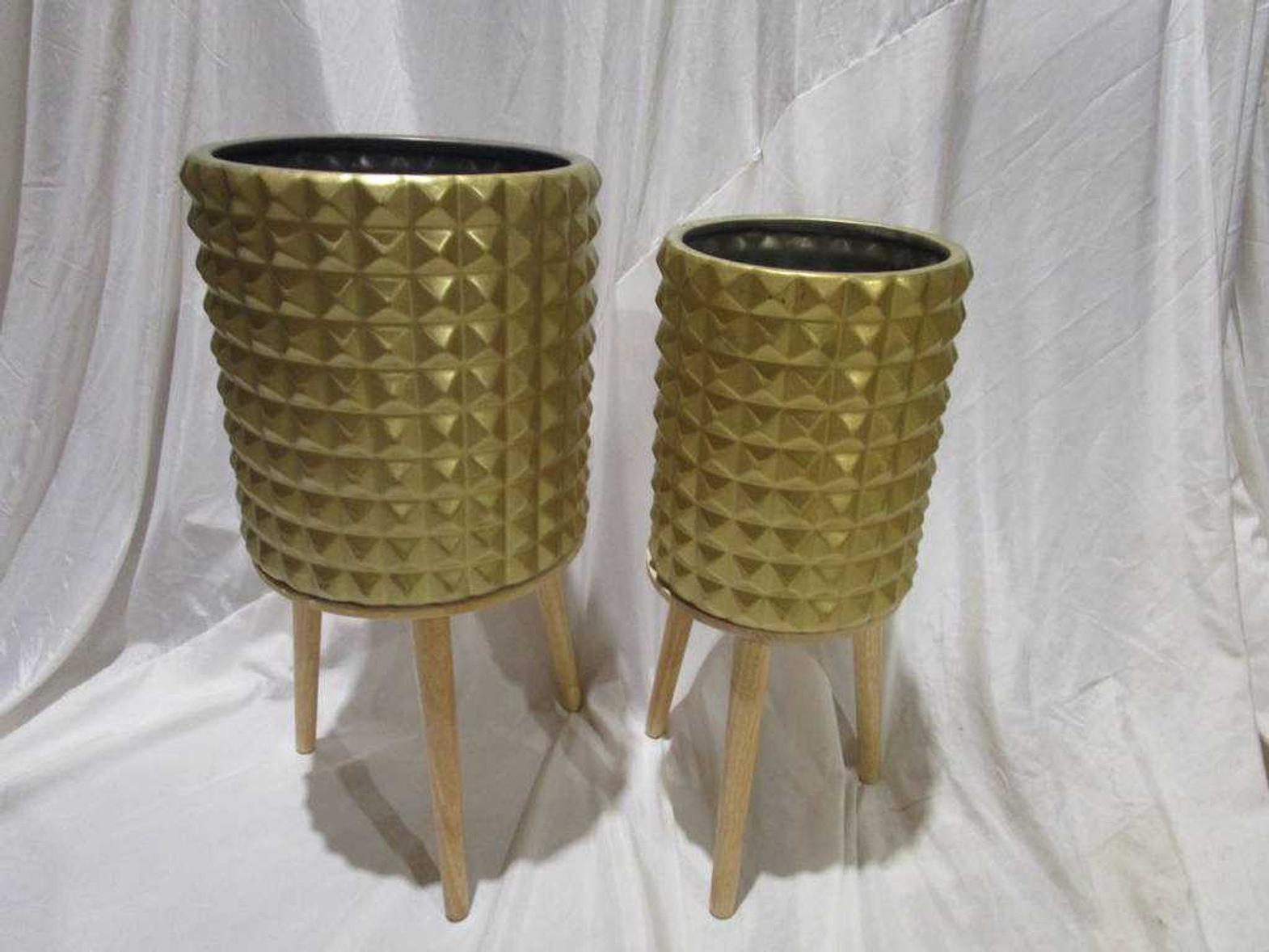 SET 10.5" PLANTER 12"PLANTER WITH WOOD STAND #REF:SH20280A SET GOLD AN# 1AC#