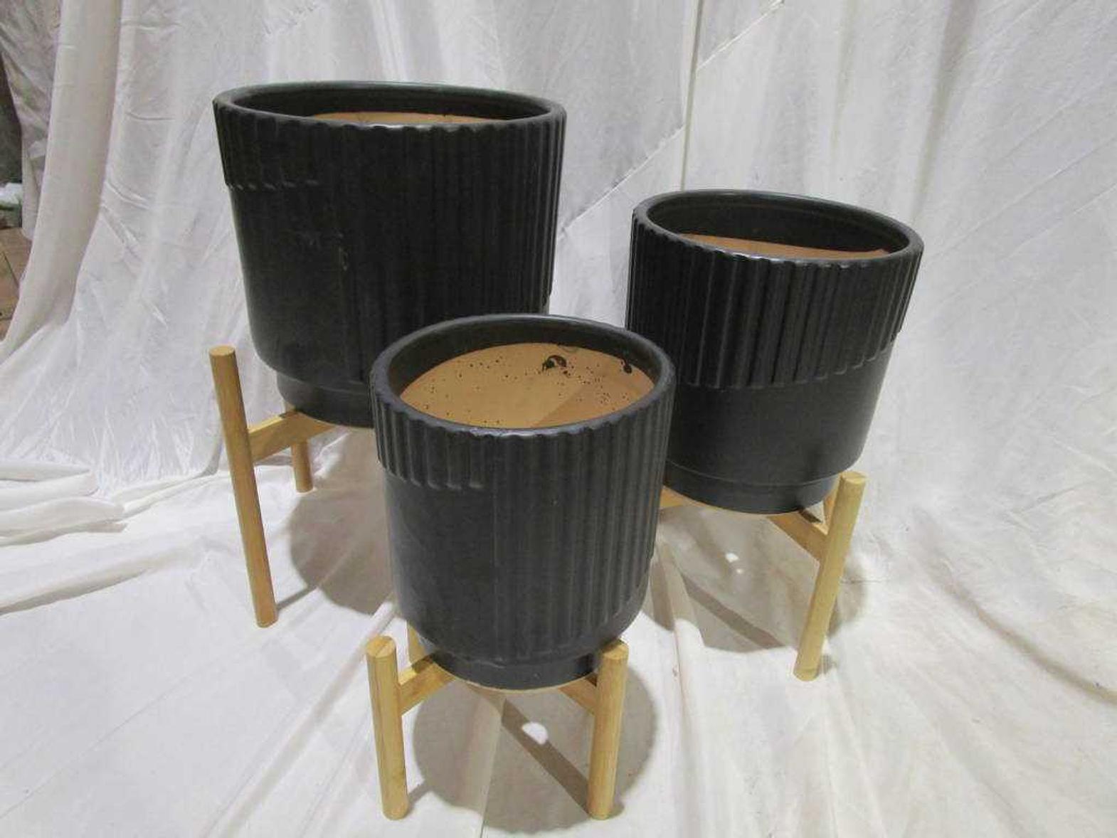 SET 8.5 PLANTER + 9.5" PLANTER+ 11"PLANTER WITH WOOD STAND #REF:SH20626 SET BLACK AN# 2AC#
