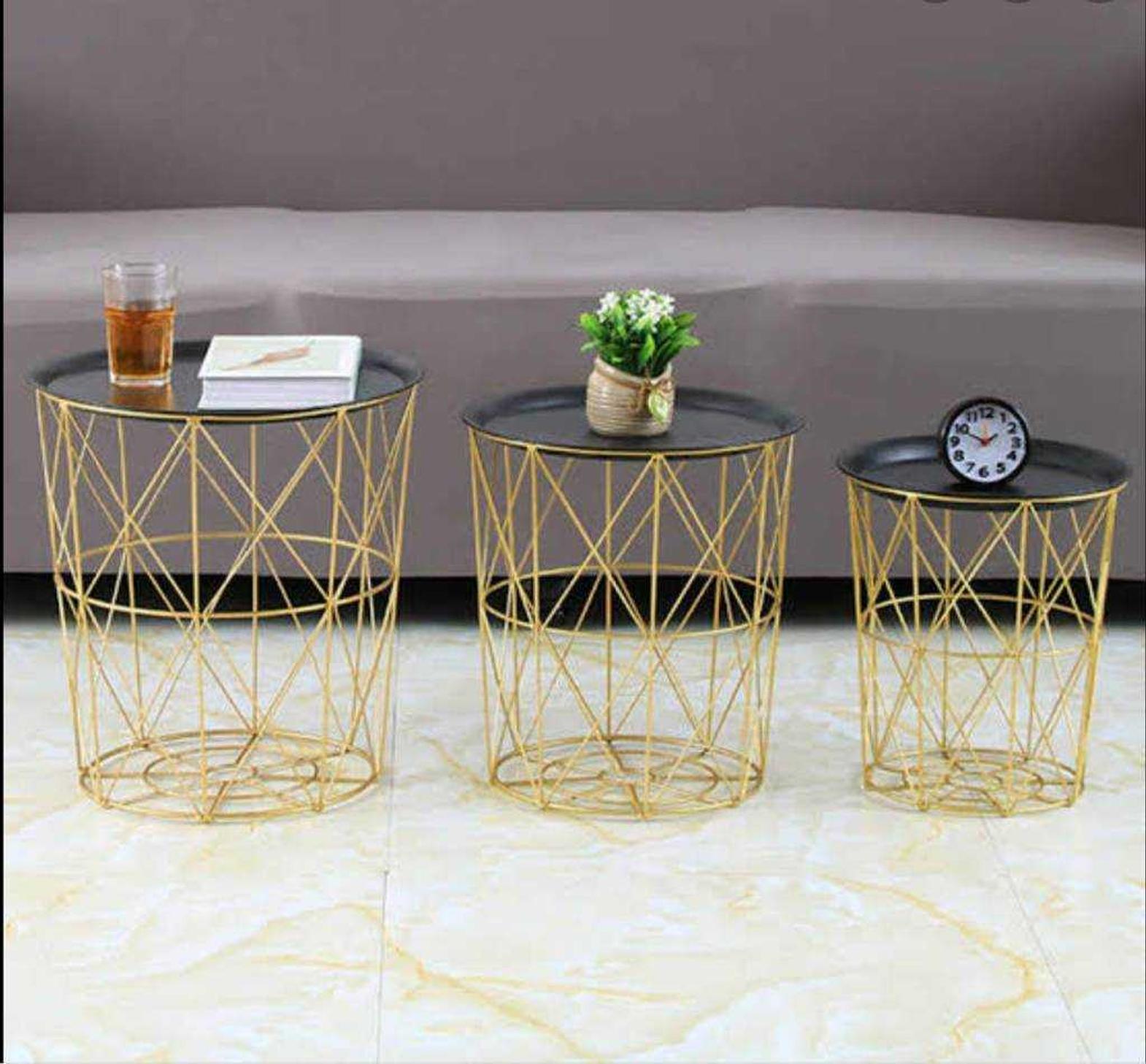 SET OF 3 ROUND METAL SIDE TABLE W METAL TOPBLACK TRAY GOLD FEET #REF:9315-1# 1AC#