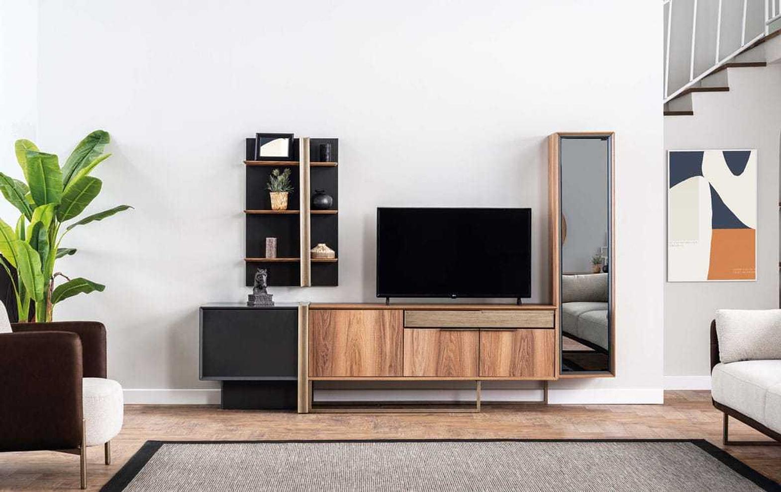 This complete TV unit offers a perfect balance of style and practicality for modern living rooms. Designed in a sophisticated mix of anthracite and walnut finishes, it brings warmth and elegance to any interior. The bottom unit, measuring 213×48×53 cm, provides a spacious base for your television along with ample storage through cabinets and compartments. Complementing it, the top unit (109×80×28 cm) adds additional shelving for décor, books, or multimedia accessories, making the set both functional and visually appealing. Durable, versatile, and stylish, this TV unit creates a well-organized entertainment hub that enhances the atmosphere of your home. Tv unit complete anthracite / walnut btm: 213x48x53cm top: 109x80x28cm #ref:mntv213# 8cl#